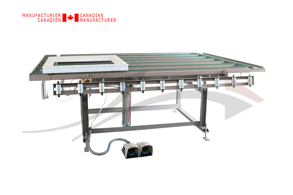 Table basculante réglable en hauteur, permet de déplacer les éléments de fenêtres d'une position d'usinage horizontale à verticale et du bas vers haut